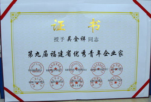 [喜訊] 日前,由共青團(tuán)福建省委員會、福建省經(jīng)濟(jì)貿(mào)易委員會、福建省國有資產(chǎn)監(jiān)督管理委員會、福建省對外貿(mào)易經(jīng)濟(jì)合作廳、福建省科學(xué)技術(shù)廳、福建省工商行政管理局、福建省國家稅務(wù)局、福建省地方稅務(wù)局、福建省環(huán)境保護(hù)局、福建省青年企業(yè)家協(xié)會共同主辦的“第九屆福建省優(yōu)秀青年企業(yè)家”評選活動揭曉,鷺燕集團(tuán)董事長兼總裁---吳金祥先生榮獲“福建省優(yōu)秀青年企業(yè)家”榮譽(yù)稱號!
